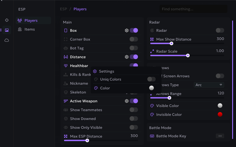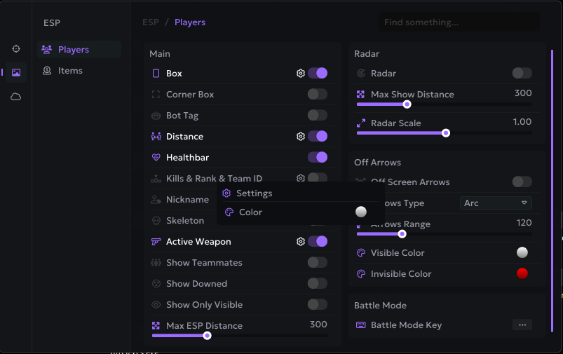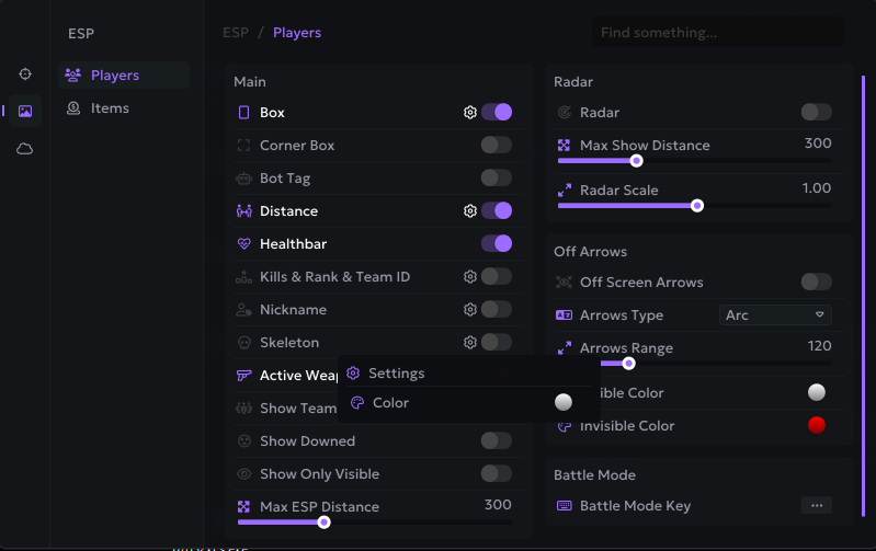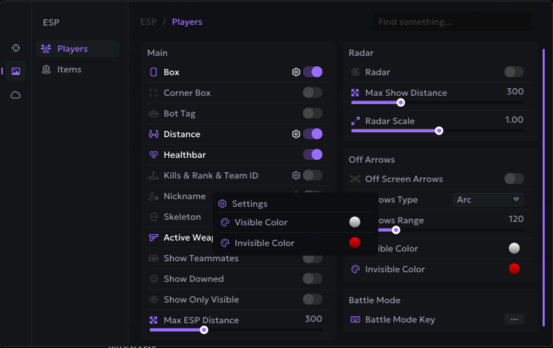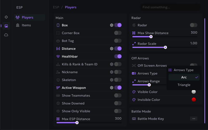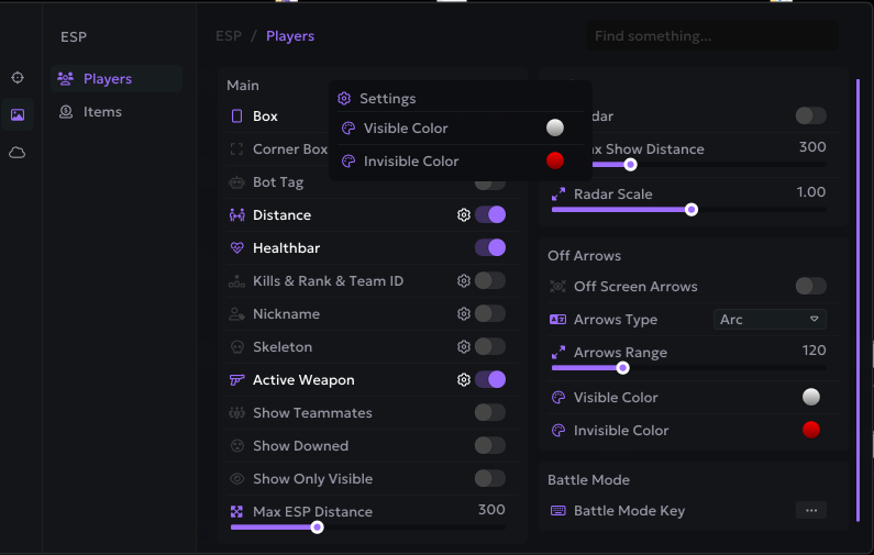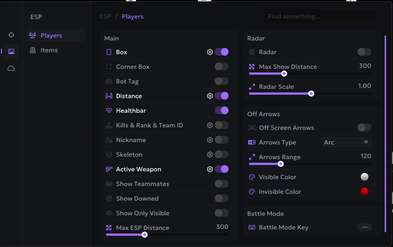 Oyuncular, radar, eşyalar & savaş modu